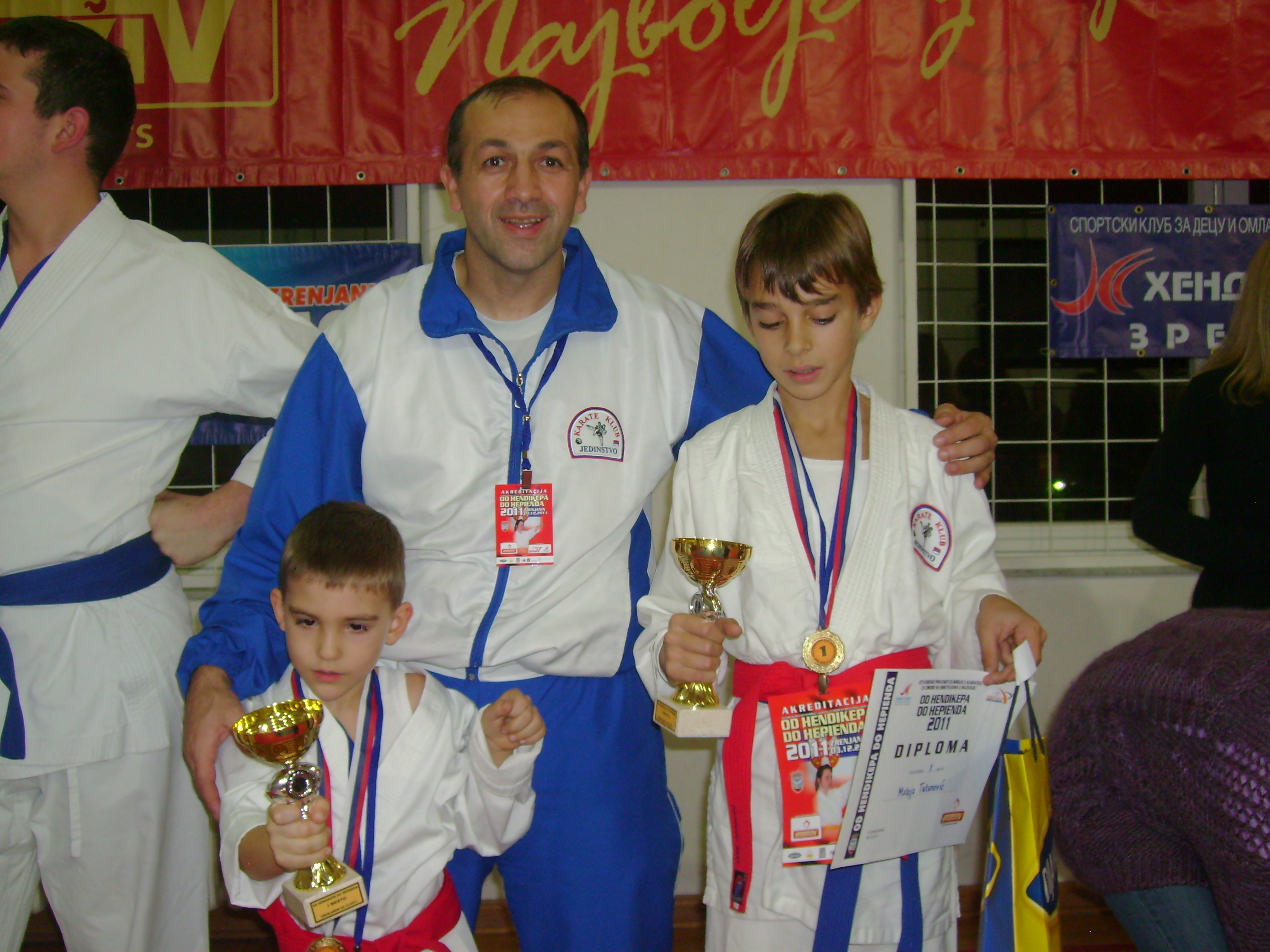 Milorad Čavić u društvu mladog člana karate kluba Jedinsto, Milošević Filipa i njegovog trenera Zoranović Vjekoslava.